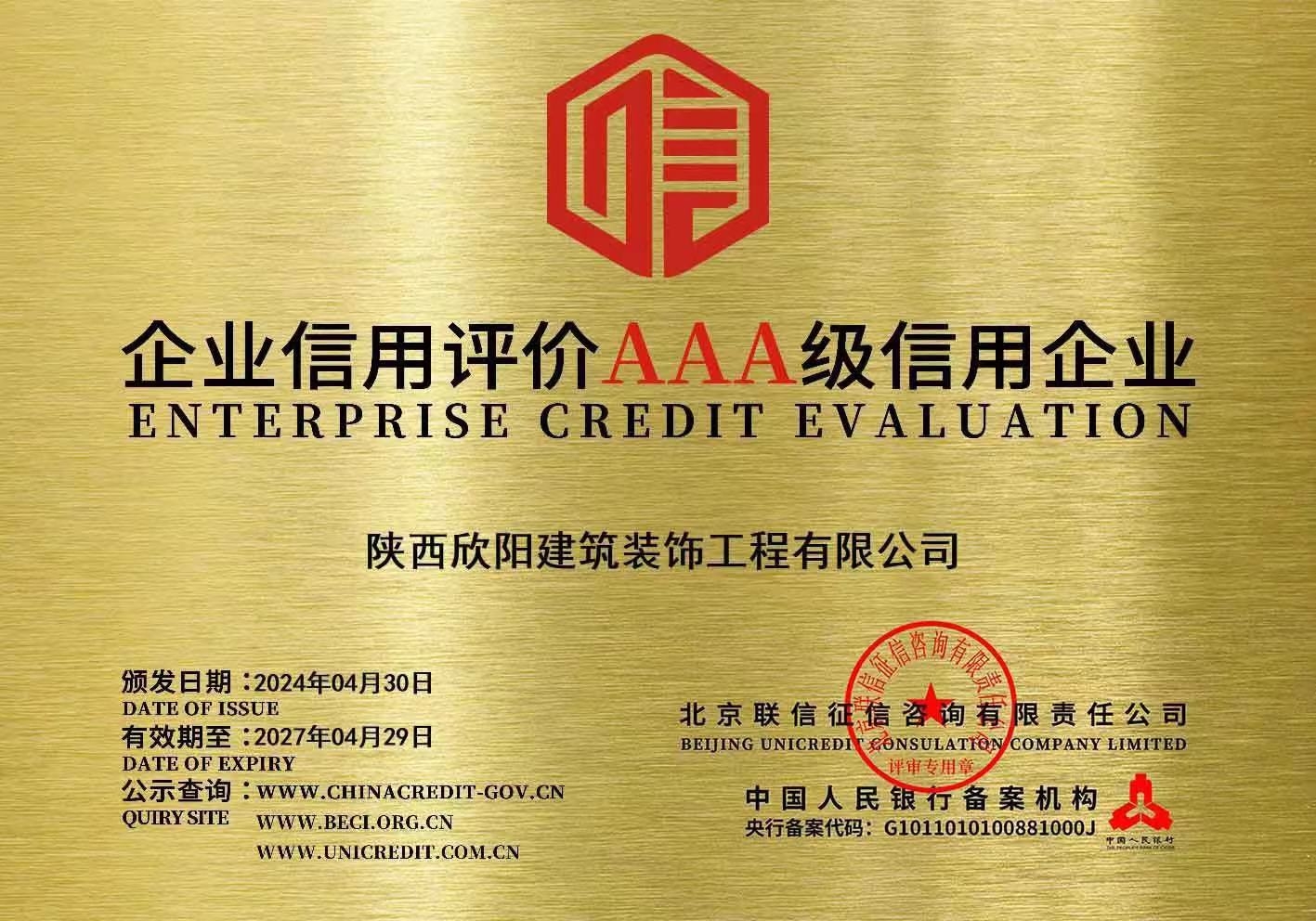喜訊!我公司榮獲企業(yè)信用評(píng)價(jià)AAA級(jí)信用企業(yè)等榮譽(yù)認(rèn)證 近日,我公司榮獲中國(guó)人民銀行備案機(jī)構(gòu)-北京聯(lián)信征信咨詢(xún)有限公司頒發(fā)的企業(yè)信用評(píng)價(jià)AAA級(jí)信用企...